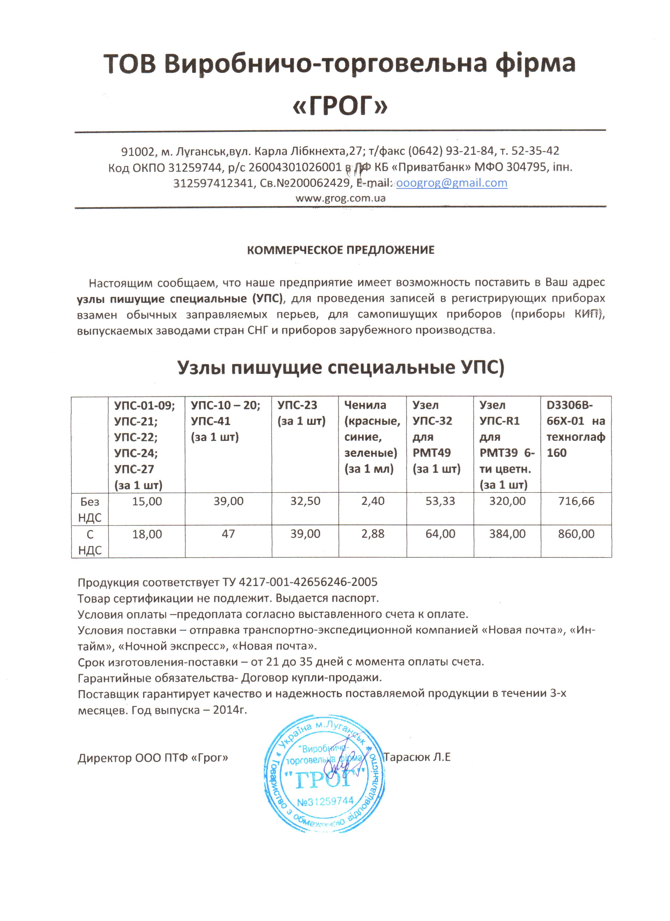 Предлагаем узлы пишущие специальные (УПС) для проведения записей в регестрирующих приборах (КИП) отечественного и зарубежного производства.
